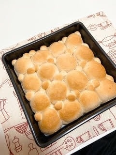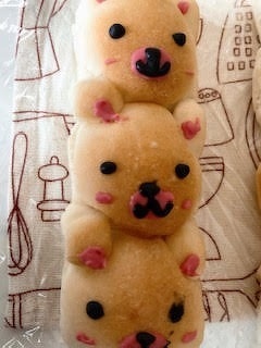 パンに耳をつけてクマさんみたいにしたり、焼き上がったパンにチョコパンで顔を書いたりしてます!