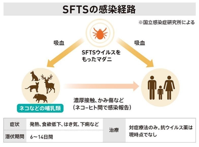 SFTSは、マダニからだけではなく感染した猫から人に感染したり、中国と韓国では人から人への感染報告もあることから、哺乳類から人へも感染すると考えられています。