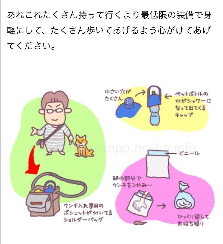 お散歩の時はビニール袋とトイレットペーパー、 お水も忘れずに持っていき、排泄物は持ち帰り、汚したところは流して帰る。
