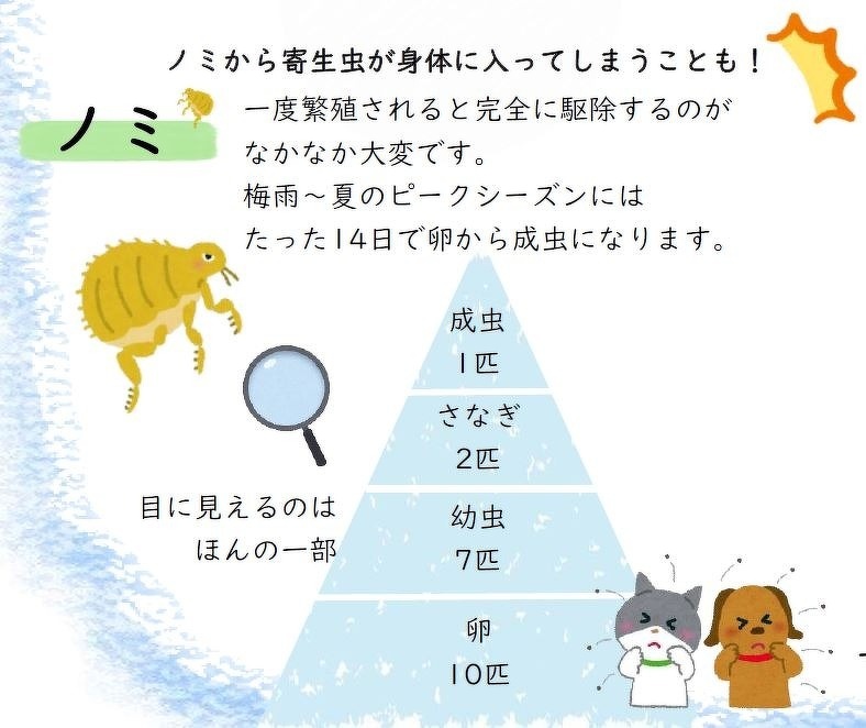 ノミは1匹いるとサナギ、幼虫、卵が約20匹分いると言われています。