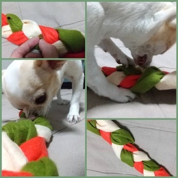 編み目にいくつかおやつを隠し、あとはビビに見つけてもらい、食べてもらうだけ♪