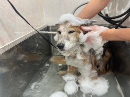 トリマーさんからの提案で、少しでもトリミング時間を軽減するために炭酸泉も入れてもらってます。