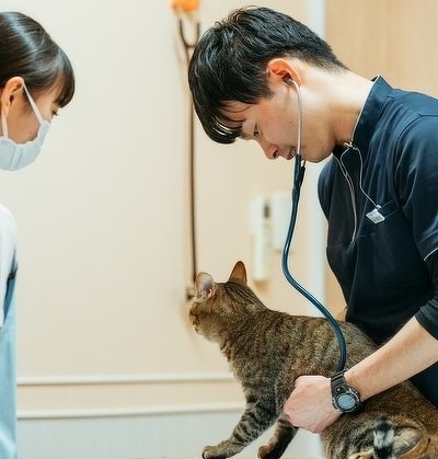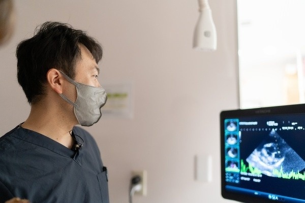 | 聴診をしっかり行い、心臓に雑音がないか、不整脈がないか、呼吸音に異常がないかなど確認していきます。身体全体の視診や触診もさせていただき、心不全の兆候や他の異常がないか確認をしていきます。 |   |