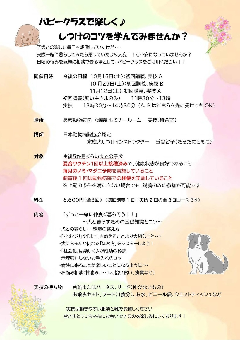 また、もうパピー期は過ぎてしまったけど、しつけの講義を受けてみたいという方も、講義のみの受講ができます!