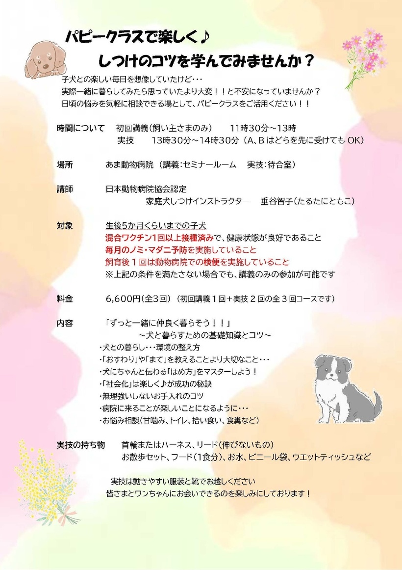 もうパピー期は過ぎてしまったけど、しつけの講義を受けてみたいという方も、講義のみの受講ができます!