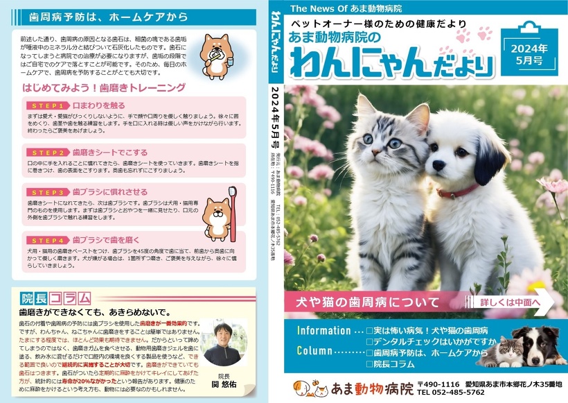 2024年4月号のあま動物病院わんにゃんだよりです♪ 今月は「予防薬と狂犬病・混合ワクチン」について、 ワクチンの重要性とノミ・マダニ・フィラリアが引き起こす病気について記載しています。 院長コラムは「お散...