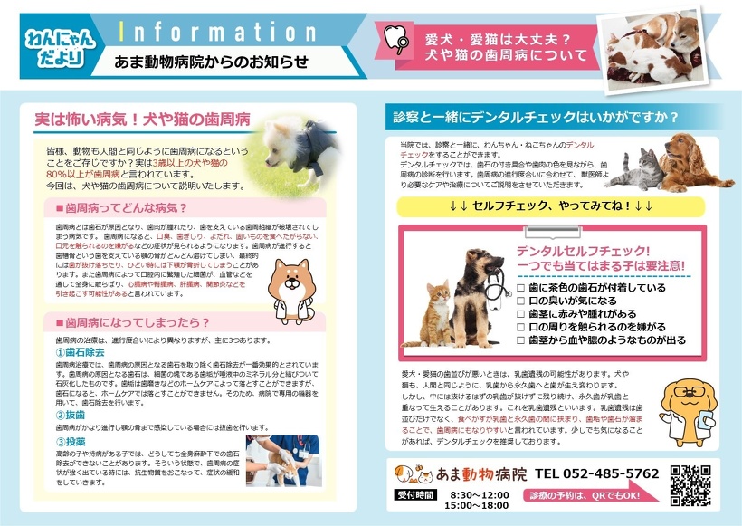 2024年3月号のあま動物病院わんにゃんだよりです♪ 今月は「健康診断とフィラリア予防」について、 健康診断の重要性やフィラリア症の症状などについて記載しています。 院長コラムは「皮膚病」についてです! 是...