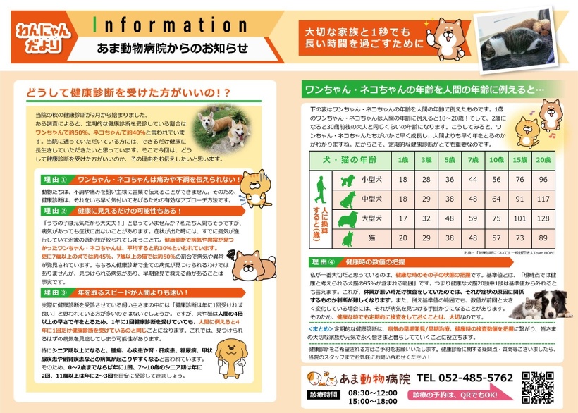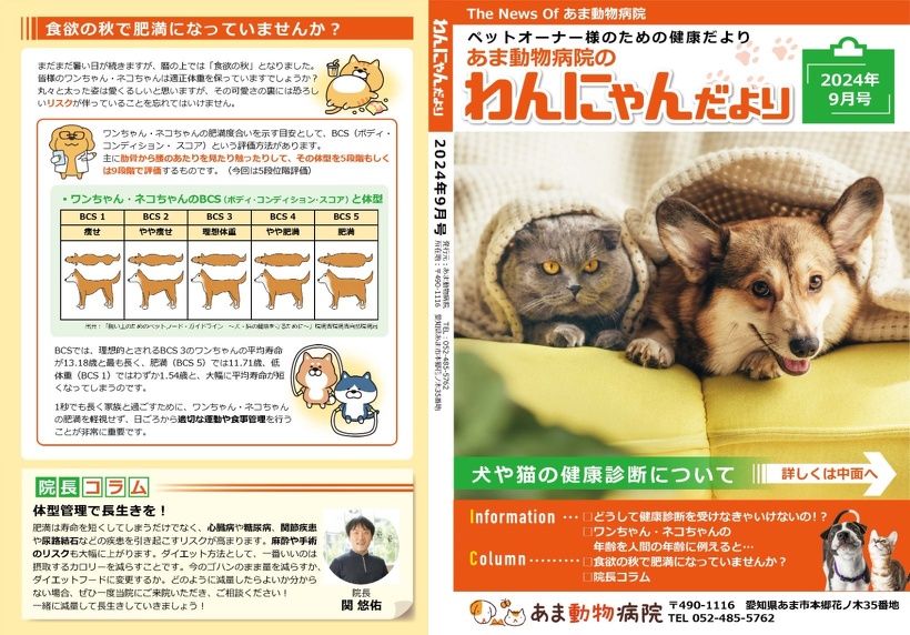 2024年09月03日(火) お知らせ わんにゃんだより2024年9月号 院内で配布させていただいているニュースレターです。 今回は、健康診断と肥満についてです。 画像だと見難くくてもうしわけありません。 ご来院頂ければ紙でお配りしております。