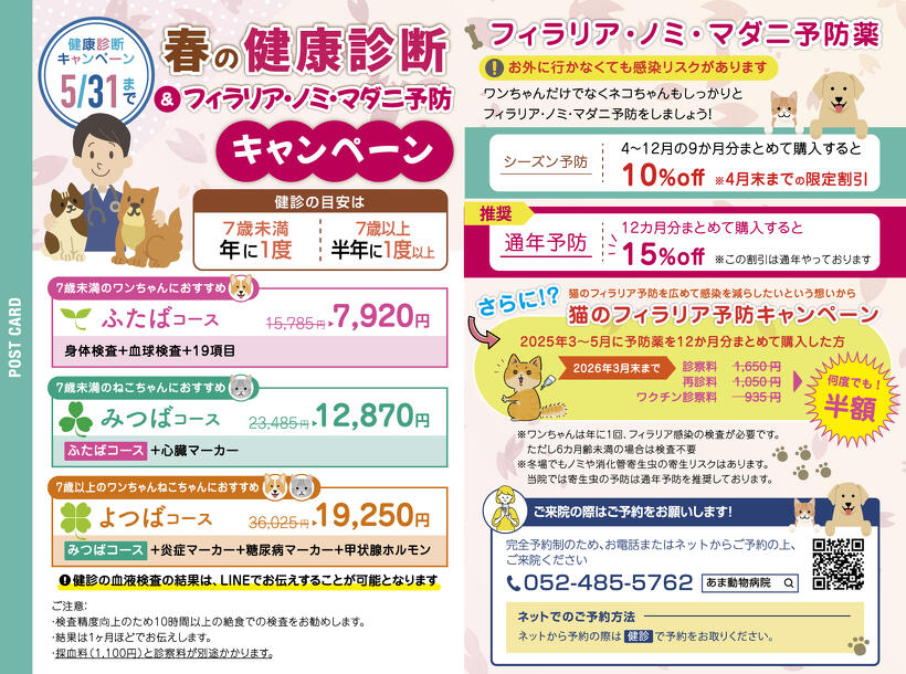 2025年04月29日(火) お知らせ ☆★春の健康診断キャンペーン実施中★☆ あま動物病院では、2025年5月末までお得な春の健康診断を実施しています。 暖かくなり始めて、動物さんと一緒におでかけしたり、飼い主さんも外出する機会が増えると思います。 その前に体調の変化に気づいて、病気の早期発見・予防のために、ぜひ健康診断をご利用ください。