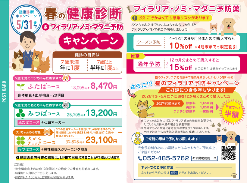 2026年04月06日(月) お知らせ NEW 春の健康診断と予防キャンペーンのお知らせ 温暖化の影響で、ノミ・マダニの感染が目立つようになってきました。1月には愛知県内でマダニが媒介するSFTSに感染した猫の死亡が報告されました。 当院では、春の健康診断キャンペーンとあわせて、フィラリア・ノミ・マダニ予防薬のご案内を行っています。 見た目には元気そうでも、病気が隠れていることは少なくありません。 健康診断で今の状態を確認し、あわせて予防も始めることで、春から安心して過ごしやすくなります。 大切なご家族の健康を守るため、この機会にぜひご相談ください。